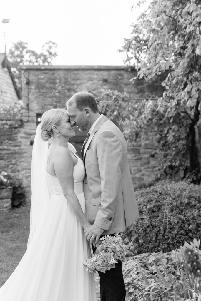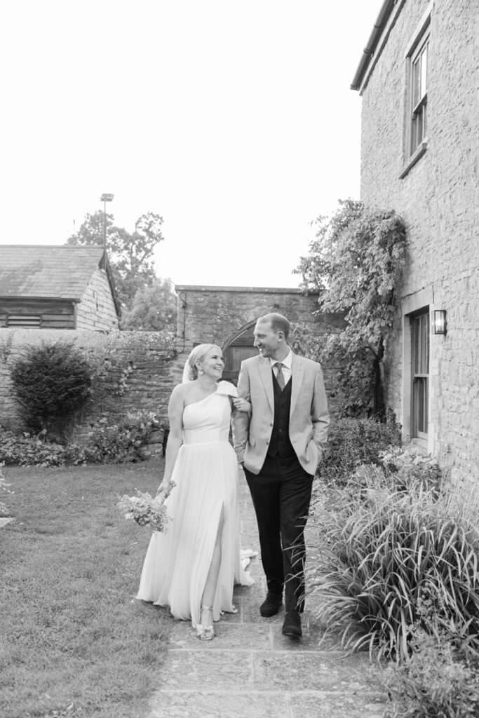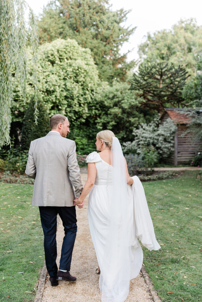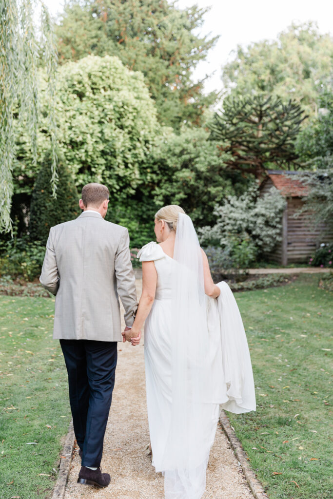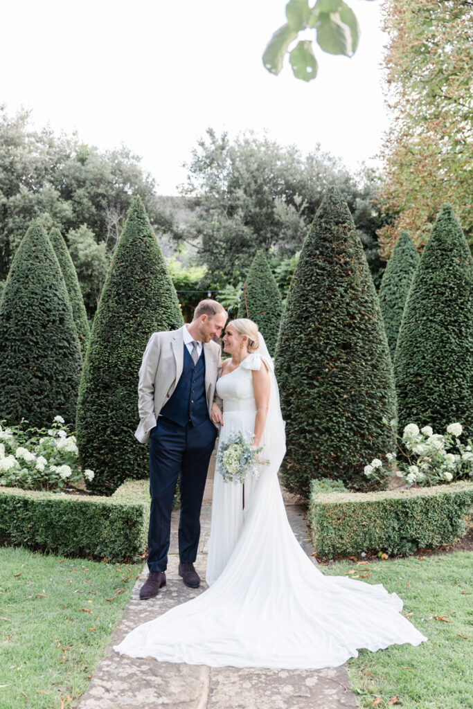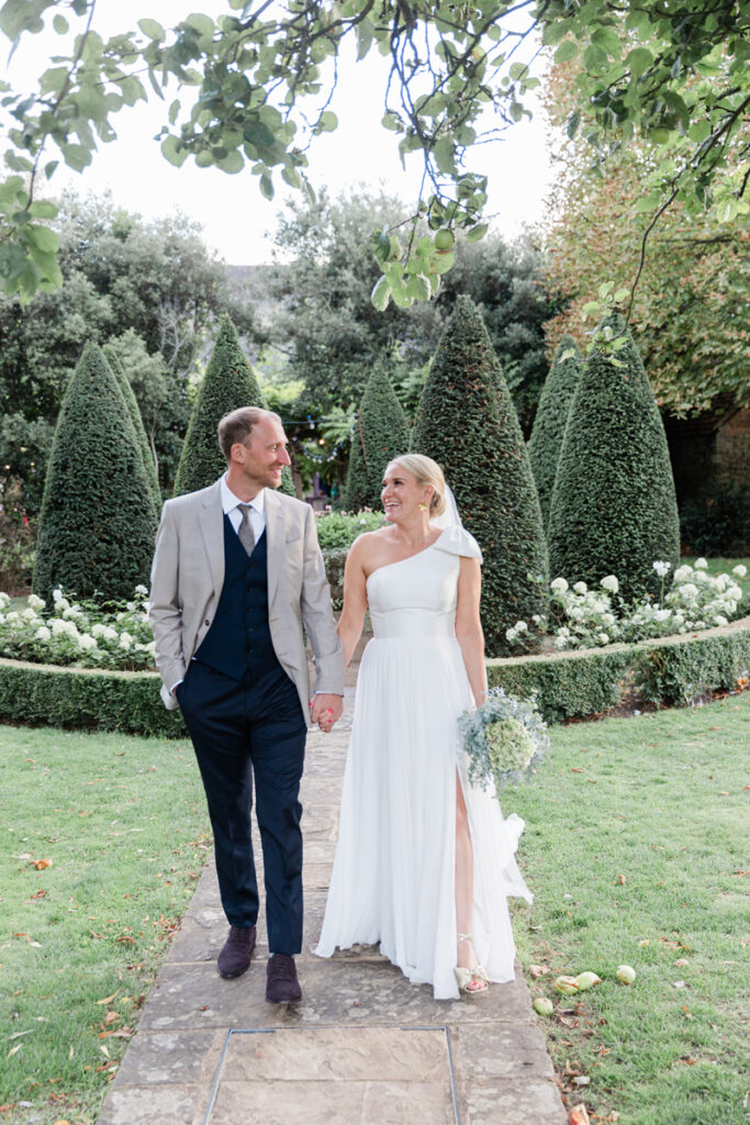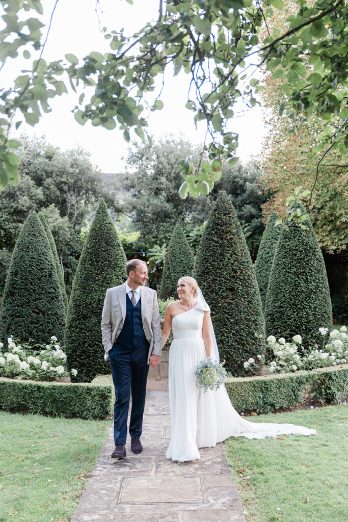 After the ceremony, we took a gentle wander through The Tythe Barn’s gardens, which are ideal for natural couple portraits. The clipped hedges, soft pathways and surrounding countryside offer so many beautiful backdrops without ever feeling forced or overly posed.